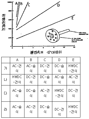 그림은 사용전류 및 자분의 종류와 탐상 가능한 불연속의 표면으로부터의 깊이와의 관계를 나타낸 도표이다. ABCDE 순으로 옳게 짝지어진 것은?