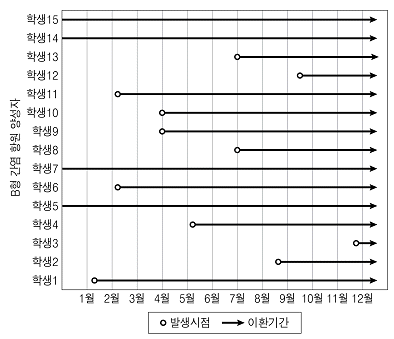 다음 그림은 A초등학교 100명의 학생 중 B형 간염 항원 양성자 15명의 발생분포이다. 4월의 B형 간염 발생률(%)은? (단, 소수점 둘째 자리에서 반올림 함)