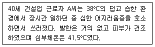 다음 사례에서 설명하는 고온장해와 보건관리자의 처치를 옳게 짝 지은 것은? 40세의 건설업 근로자 A씨는 38°C의 덥고 습한 환경에서 장시간 일하던 중 심한 어지러움증을 호소하면서 쓰러졌다. 발한은 거의 없고 피부가 건조하였으며 심부체온은 41.5°C였다.