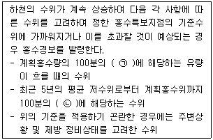 「수자원의 조사ㆍ계획 및 관리에 관한 법률 시행규칙」상 홍수특보 발령 기준에 대한 규정 내용의 일부이다. ㉠, ㉡에 들어갈 내용으로 옳은 것은? (순서대로 ㉠, ㉡)