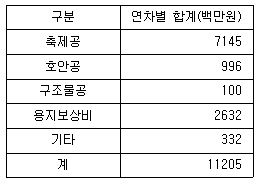 다음은 연차별 투입계획에 따른 각 사업비 합계금액이다. 각 시설물별 잔존가치는 축제공 80%, 호안공 10%, 구조물 0%, 보상비100% 정도일 때 연평균 유지관리비는 얼마인가? (단, 연평균 유지관리비는 잔존가치를 고려하여 사업비의 약 2%로 설정하며 계산은 소수점 둘째자리에서 반올림함)
