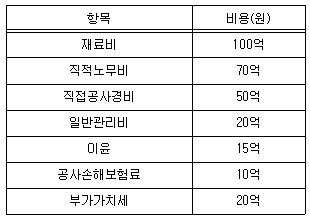 A공사의 사업비가 다음 표와 같을 때 계약예규에 따른 직접공사비에 포함되는 항목만을 더한 값은 얼마인가? (단, 제시된 비용회에는 무시한다.)