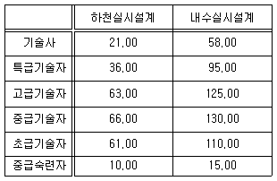 직접인건비 산정을 위한 소요인력이 다음과 같을 때 복합재해 (하천, 내수) 실시설계에 있어 직접인건비산출을 위한 기술사 소요인력 (인/일)은 얼마인가? (단, 하천실시설계 위험지구 연장은 2km이고 내수 실시설계 침수예장면적은 3km2이며 펌프장이 없다고 가정한다. 지역적 특성 따른 보정계수 1.0 가정)