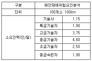 다음표를 참조하여 방재분야 표준품셈에 따른 자연재해저감 종합계획 단계에서 해안재해위험지구를 기준으로 하는 단위 업무의 기술사 소요인력은? (단, 해안재해 위험지구는 18개소이다.)