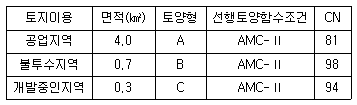 다음의 표를 이용하여 전체면적 5.0km2인 지역의 내수재해 취약요인 분 석시 NRCS방법에 의한 유효우량 산정을 위한 유출 곡선지수(CN)를 옳게 산정한 것은? (단, 유역의 선행토양함수조건은 AMC-Ⅱ이다.)