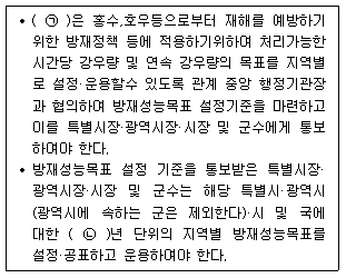 자연재해대책법령상 명시된 지역별 방재성능 목표 설정에 관한 사항으로 ( )에 알맞은 내용은?