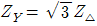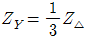 평형 3상 교류 회로에서 Δ부하의 한 상의 임피던스가 ZΔ일 때, 등가 변환한 Y부하의 한 상의 임피던스 ZY는 얼마인가?