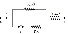 그림과 같은 회로에서 a-b간에 E(V)의 전압을 가하여 일정하게 하고, 스위치 S를 닫았을 때의 전전류 I(A)가 닫기 전 전류의 3배가 되었다면 저항 Rx의 값은 약 몇 Ω인가?