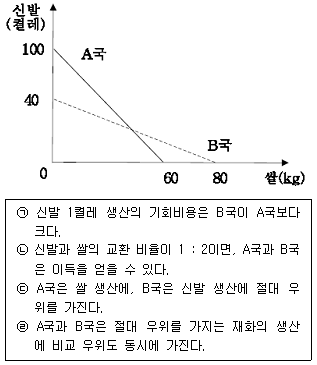 다음 그림은 신발과 쌀만을 생산하는 A국과 B국의 생산 가능 곡선이다. 이를 분석하고 추론한 설명으로 옳은 것을 <보기>에서 모두 고른 것은? (단, 양국이 보유한 생산 요소의 양은 동일하며, 양국은 이익이 발생하는 경우 비교 우위 재화에 특화하여 무역한다.)