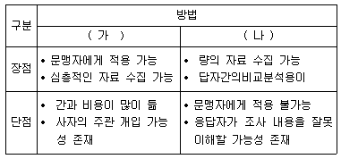 다음은 사회 문화 현상 연구를 위한 자료 수집 방법 중 일부에 대한 내용이다. (가)와 (나)를 올바르게 나타낸 것으로 가장 적절한 것은? (순서대로 (가), (나)) ((문제 오류로 실제 시험에서는 1, 4번이 정답처리 되었습니다. 여기서는 1번을 누르면 정답 처리 됩니다.)