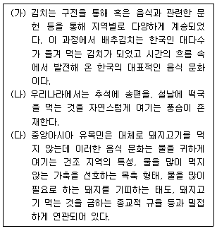다음은 다양한 문화의 속성 중 일부의 사례를 설명한 글이다. (가), (나), (다)의 문화적 속성을 표현한 것으로 가장 적절한 것은? (순서대로 (가), (나), (다))