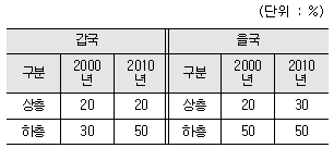 다음은 갑국과 을국의 계층별 비율을 나타낸 것이다. 이에 대한 분석으로 가장 적절한 것은? (단, 계층은 상, 중, 하만 존재한다.)