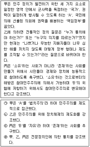 다음은 민주주의에 대한 의견이다. 이에 대한 옳은 설명을 보기에서 모두 고른 것은? (단, 甲~丙은 프롬(Fromm, E.), 후쿠야마(Fukuyama, F.), 포퍼(Popper, K.) 중 서로 다른 하나이다.)