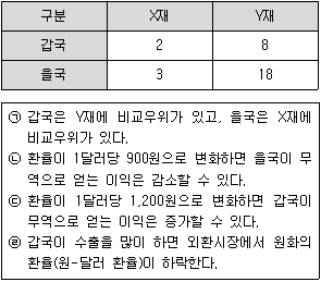 다음은 갑국과 을국에서 노동자 1명이 생산할 수 있는 X재와 Y재의 수량을 나타낸다. 각 국은 비교우위가 있는 제품에 특화해 무역을 한다. 갑국은 원화를 화폐로 사용하고, 을국은 달러를 화폐로 사용하며, 국제시장에서 환율은 1달러당 1,000원에 거래된다. 현재 X재 1개와 Y재 1개의 제품가격은 각각 갑국에서 5,000원과 1,000원으로, 을국에서 5달러와 1달러로 형성되어 있다. 두 나라의 교역조건과 환율에 대한 다음의 설명으로 가장 적절한 것만을 <보기>에서 모두 고른 것은? (단, 재화는 국제시장에서 재화가 생산된 국가의 통화로 거래된다. 또한, 환전에 따른 거래비용은 없으며 환율 변화에 따른 추가 거래량의 변화는 없다고 가정한다.)