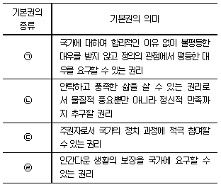 다음 표는 '기본권'의 의미를 설명한 것이다. ㉠부터 ㉣까지의 설명으로 가장 적절하지 않은 것은?