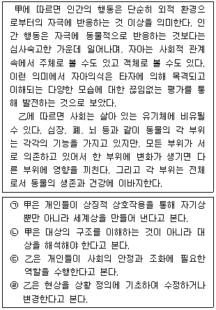 다음 甲과 乙은 사회 현상을 바라보는 서로 다른 관점이다. 다음 관점과 관련되어 옳게 설명한 것을 보기에서 모두 고른 것은? (단, 甲과 乙은 각각 기능론, 갈등론, 상징적 상호작용론 중 하나이다.)