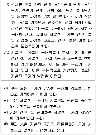 다음 甲과 乙은 근대화를 바라보는 관점이다. 甲과 乙의 관점에 대한 설명으로 옳은 것을 보기에서 모두 고른 것은? (단, 甲과 乙은 종속 이론과 근대화론 중 하나이다.)