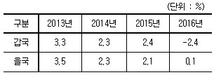 다음 표는 갑국과 을국의 연도별 경제 성장률을 나타낸 것이다. 이에 대한 분석으로 가장 적절한 것은? (단, 기준 연도는 2012년이다.)