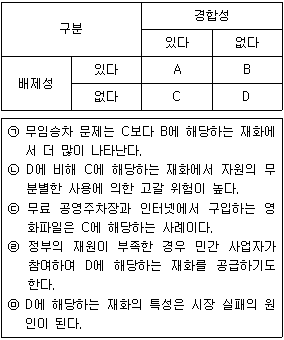 재화 및 서비스는 배제성과 경합성을 기준으로 A, B, C, D 네 가지로 분류할 수 있다. 이에 대한 설명으로 적절한 것만을 <보기>에서 모두 고른 것은?