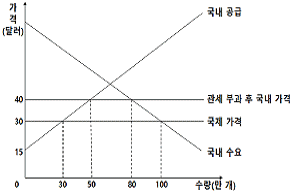 다음 그림은 관세 부과에 따른 甲국의 X재 시장 상황을 나타낸다. 甲국은 국제 가격에 개당 10달러의 관세를 부과하여 X재를 수입하고 있다. X재의 국제 가격은 일정하며, 이 가격에서 X재를 무제한 수입할 수 있다. 이에 대한 설명으로 가장 적절하지 않은 것은? (단, 언급되지 않은 다른 조건은 변함이 없다.)