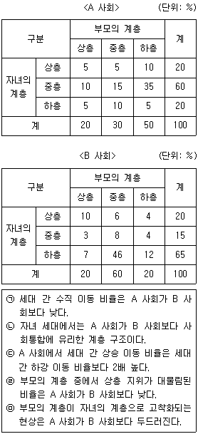다음 표는 A 사회와 B 사회의 세대 간 이동에 따른 계층 구성 비율을 나타낸 것이다. 이에 대한 분석으로 적절한 것만을 <보기>에서 모두 고른 것은?