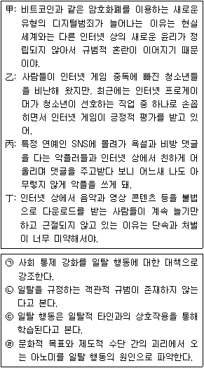 다음 인터넷 일탈 행동 사례에 대한 甲∼丁의 대화 내용과 <보기>의 설명을 짝지은 것으로 가장 적절하지 않은 것은?