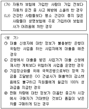 다음 (가), (나)는 정보의 비대칭으로 발생할 수 있는 시장 실패의 사례이다. 여기서 나타나는 시장 실패의 종류와 유사한 사례를 <보기>에서 골라 바르게 연결한 것은?