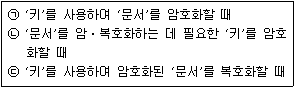 대칭키 암호시스템과 공개키 암호시스템의 장점을 조합한 것을 하이브리드 암호시스템이라고 부른다. 하이브리드 암호시스템을 사용하여 송신자가 수신자에게 문서 를 보낼 때의 과정을 순서대로 나열하면 다음과 같다. 각 시점에 적용되는 암호시스템을 순서대로 나열하면?