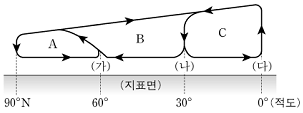 그림은 북반구의 대기 대순환과 지표면 위의 세 지역 (가), (나), (다)를 나타낸 것이다. 이에 대한 설명으로 옳은 것은?