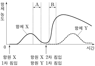 그림은 항원 X와 Y가 사람에게 침입했을 때 시간에 따른 혈중 항체 X와 Y의 농도를 나타낸 것이다. 이에 대한 설명으로 옳은 것은?