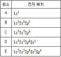 표는 몇 가지 원소의 바닥상태 전자 배치를 나타낸 것이다. 이온 결합을 형성하고 있는 물질은? (단, A∼E는 임의의 원소 기호이다.)