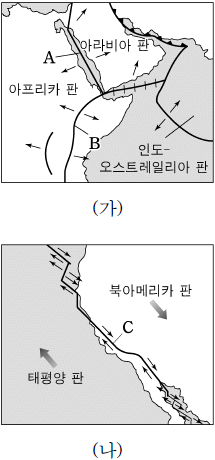 그림 (가)와 (나)는 두 지역의 판의 경계와 이동 방향을 나타낸 것이다. 이에 대한 설명으로 옳은 것은?