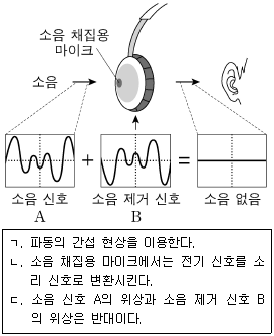 그림은 소음을 제거하는 헤드폰의 원리를 간단히 나타낸 것이다. 이에 대한 설명으로 옳은 것만을 <보기>에서 있는 대로 고른 것은?