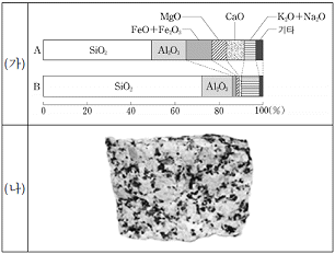 그림 (가)는 화성암 A와 B의 구성 성분비를 나타낸 것이고, 그림 (나)는 A와 B 중 한 암석의 겉모습이다. 이에 대한 설명으로 옳은 것은?