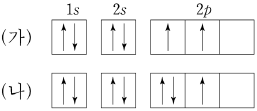 그림 (가)와 (나)는 탄소(C) 원자와 질소(N) 원자 각각의 전자 배치를 나타낸 것이다. (가)와 (나)에 대한 설명으로 옳은 것은? (단, n은 주양자수이고, l은 방위(부) 양자수이다.)