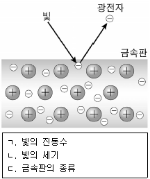 그림은 금속판에 빛을 비추었을 때 금속에서 광전자가 방출되는 현상을 나타낸 것이다. 이때 방출되는 광전자의 최대 운동 에너지에 영향을 미치는 변수로 옳은 것만을 <보기>에서 있는 대로 고른 것은?