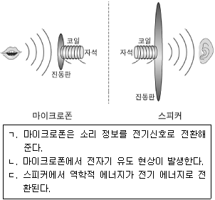 그림은 마이크로폰과 스피커의 작동 원리를 나타낸 것이다. 이에 대한 설명으로 옳은 것만을 <보기>에서 있는 대로 고른 것은?