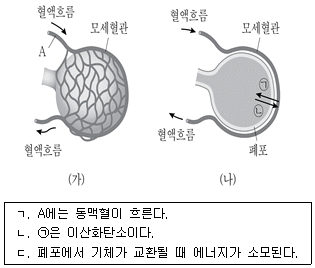 그림 (가)는 폐포를, (나)는 폐포의 단면을 나타낸 것이다. ㉠과 ㉡은 각각 산소와 이산화탄소 중 하나이다. 이에 대한 설명으로 보기에서 옳은 것만을 모두 고른 것은?