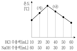 그림은 어떤 염산(HCl) 수용액과 수산화나트륨(NaOH) 수용액을 다양한 부피비로 섞은 용액의 최고 온도를 나타낸 것이다. 이에 대한 설명으로 옳은 것은? (단, 열손실은 없다고 가정한다)