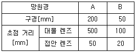 표는 가시광 망원경 A와 B의 구경과 초점 거리를 나타낸 것이다. 망원경의 집광력비(A의 집광력/B의 집광력)와 배율비(A의 배율/B의 배율)를 옳게 짝지은 것은?(순서대로 집광력비, 배율비)