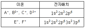표는 원소 A~F의 이온들에 대한 전자배치를 나타낸 것이다. 이에 대한 설명으로 옳은 것은? (단, A~F는 임의의 원소 기호이다)