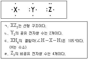 그림은 2주기 비금속 원자 X~Z의 루이스 전자점식을 나타낸 것이다. 보기의 설명으로 옳은 것만을 모두 고르면? (단, X~Z는 임의의 원소 기호이며, 보기의 물질에서 X~Z는 옥텟 규칙을 만족한다)