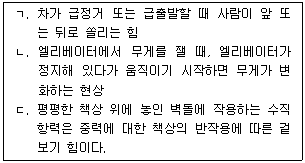 관성력은 물체 사이의 상호작용에 의한 힘이 아니고 관측자가 가속운동을 하기 때문에 느껴지는 겉보기 힘이다. 이에 대한 현상으로 옳은 것만을 모두 고르면?