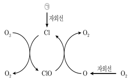 그림은 대기권에서 일어나는 오존의 생성 또는 소멸과 관련 있는 과정을 나타낸 것이다. 이에 대한 설명으로 옳은 것은?