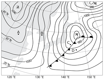 그림은 어느 날 우리나라 주변의 지상 일기도이다. 이에 대한 설명으로 옳은 것은?