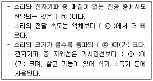 다음은 소리와 전자기파의 특성을 나열한 것이다. ㉠~㉣에 들어갈 말을 옳게 짝 지은 것은?