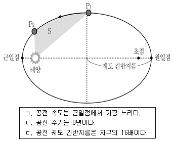 그림은 케플러 법칙을 만족하는 어떤 소행성의 공전 궤도를 나타낸 것이다. P1에서 P2까지 이동하는 데 걸리는 시간은 1년이고, 색칠한 부분의 면적 S는 전체 궤도 면적의 1/8 이었다. 이 소행성에 대한 설명으로 보기에서 옳은 것만을 모두 고른 것은?
