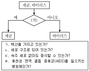 그림은 세균과 바이러스를 기준 (가)에 따라 분류한 것이다. (가)에 해당하는 것으로 옳은 것만을 보기에서 고른 것은?