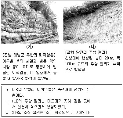 다음은 영희가 서로 다른 두 지역 (가)와 (나)를 지질 답사한 후 작성한 보고서의 일부이다. 이에 대한 설명으로 보기에서 옳은 것만을 모두 고른 것은?