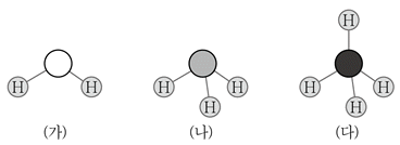 그림 (가)~(다)는 2주기의 서로 다른 중심 원자에 수소(H)가 결합된 중성인 분자 모형을 나타낸 것이다. 이에 대한 설명으로 옳은 것은? (단, (가)~(다)의 중심 원자는 옥텟 규칙을 만족한다.)